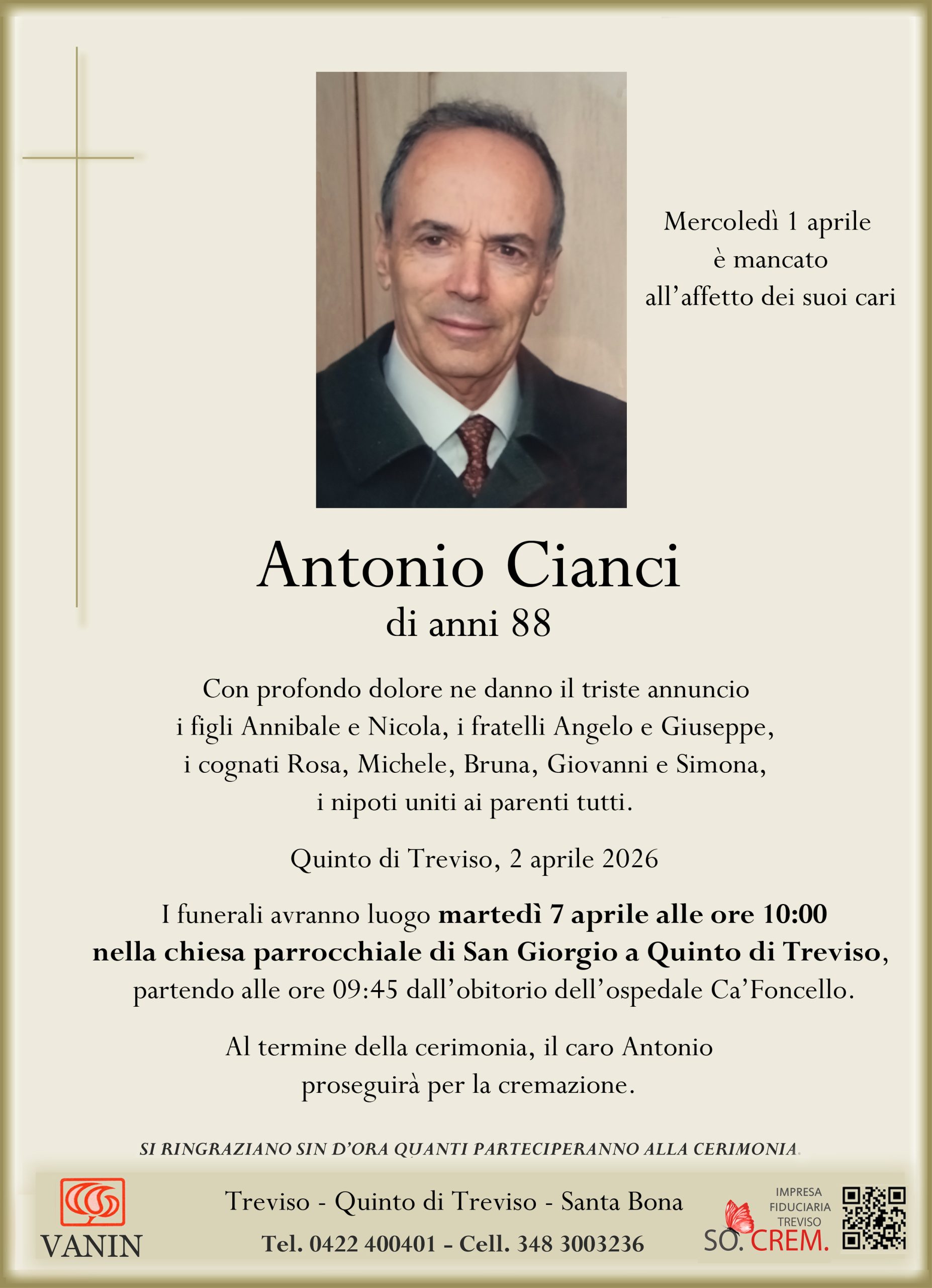 Data del decesso: Mercoledì 1 aprile 2026Data cerimonia: Martedì 7 Aprile 2026