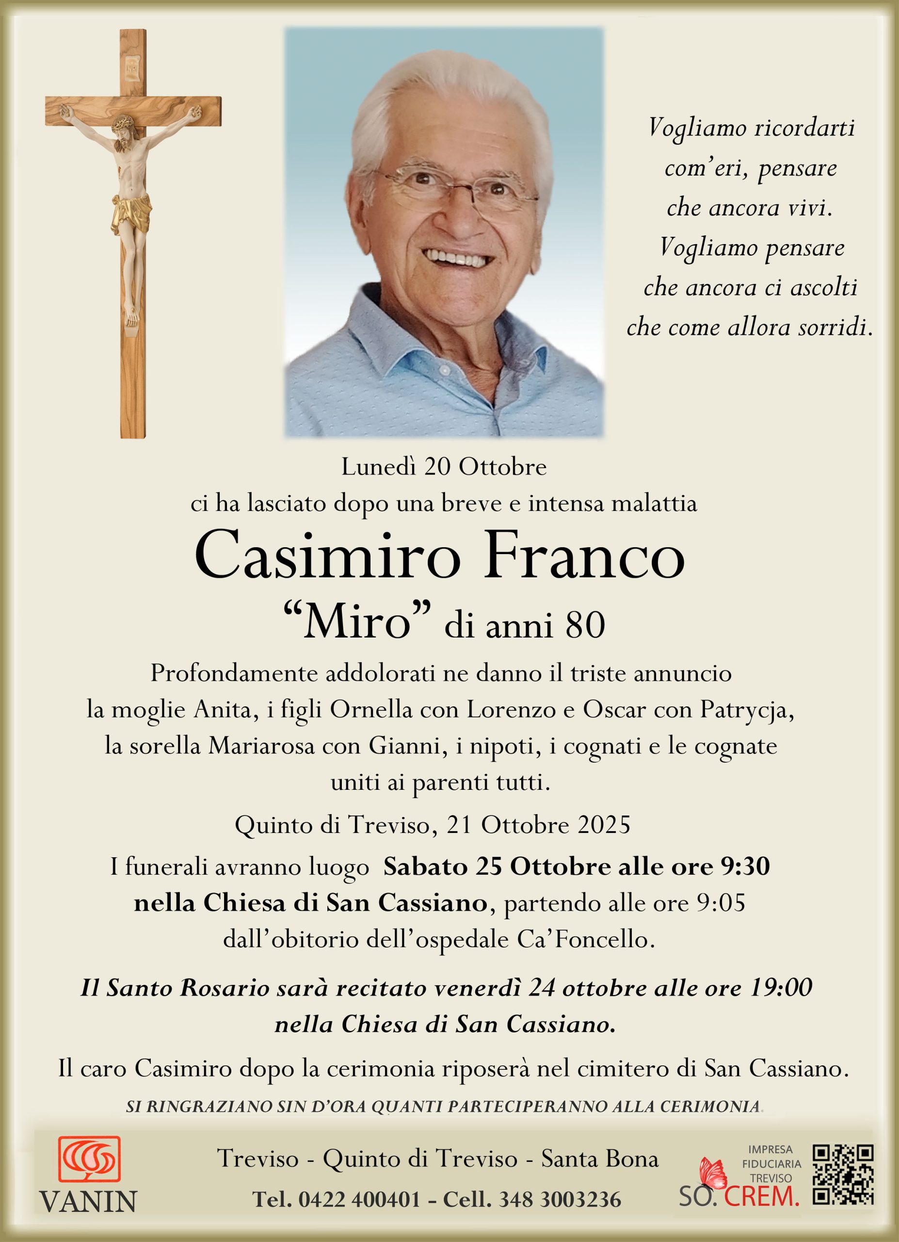 I funerali avranno luogo Sabato 25 Ottobre alle ore 9:30