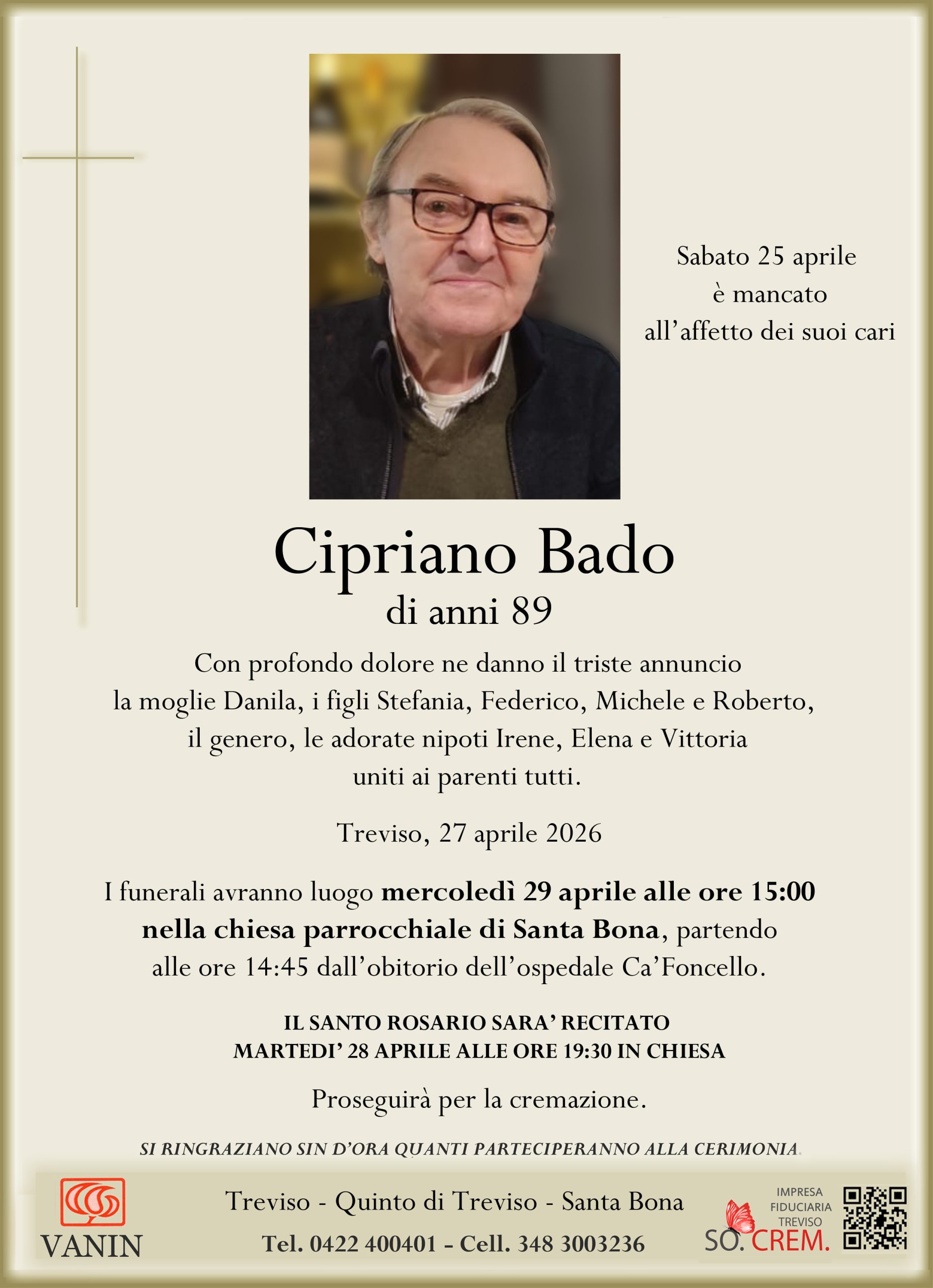 Data del decesso: Sabato 25 Aprile 2026Data cerimonia: Mercoledì 29 Aprile 2026