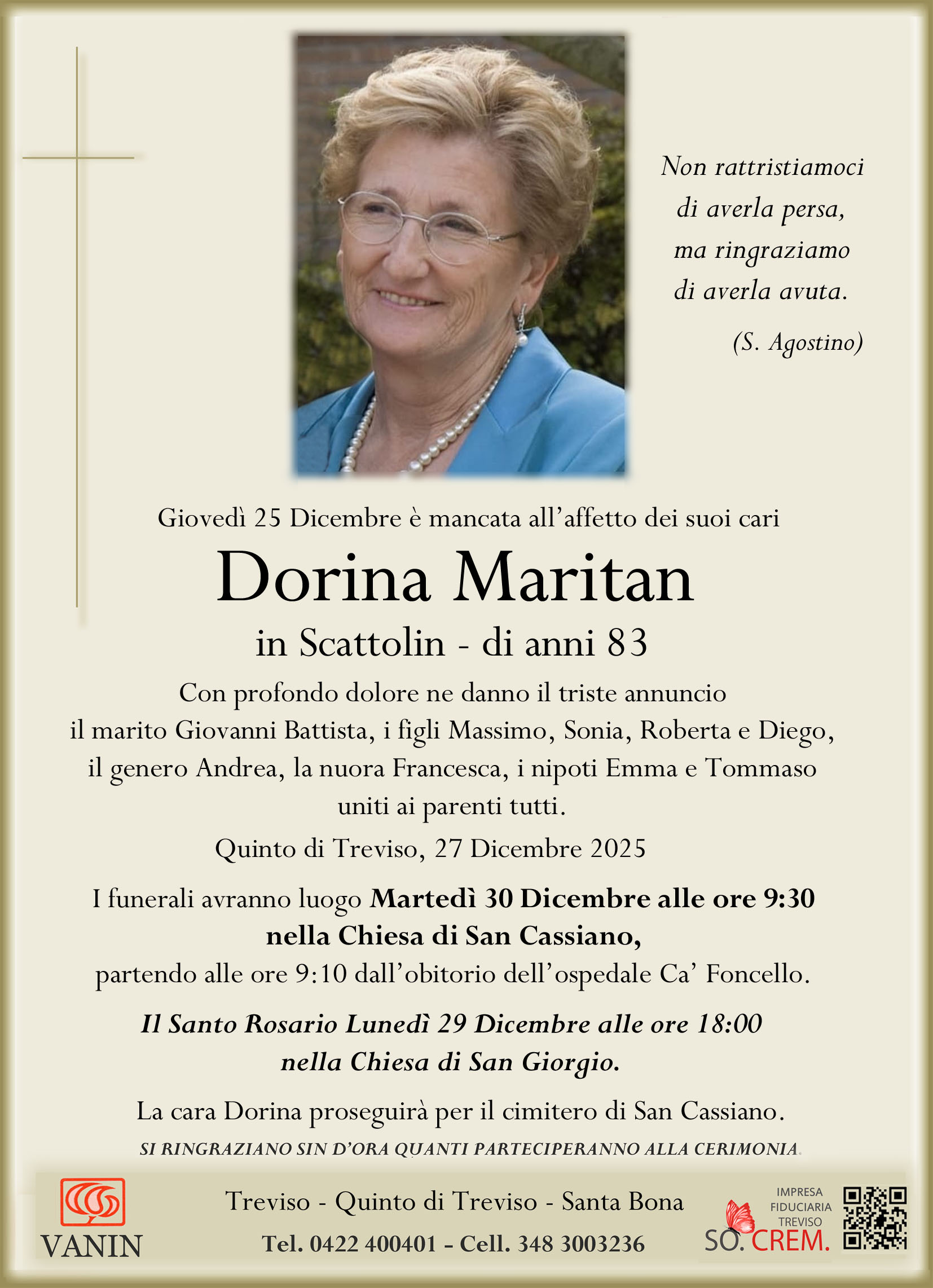 I funerali avranno luogo Martedì 30 Dicembre alle ore 9:30