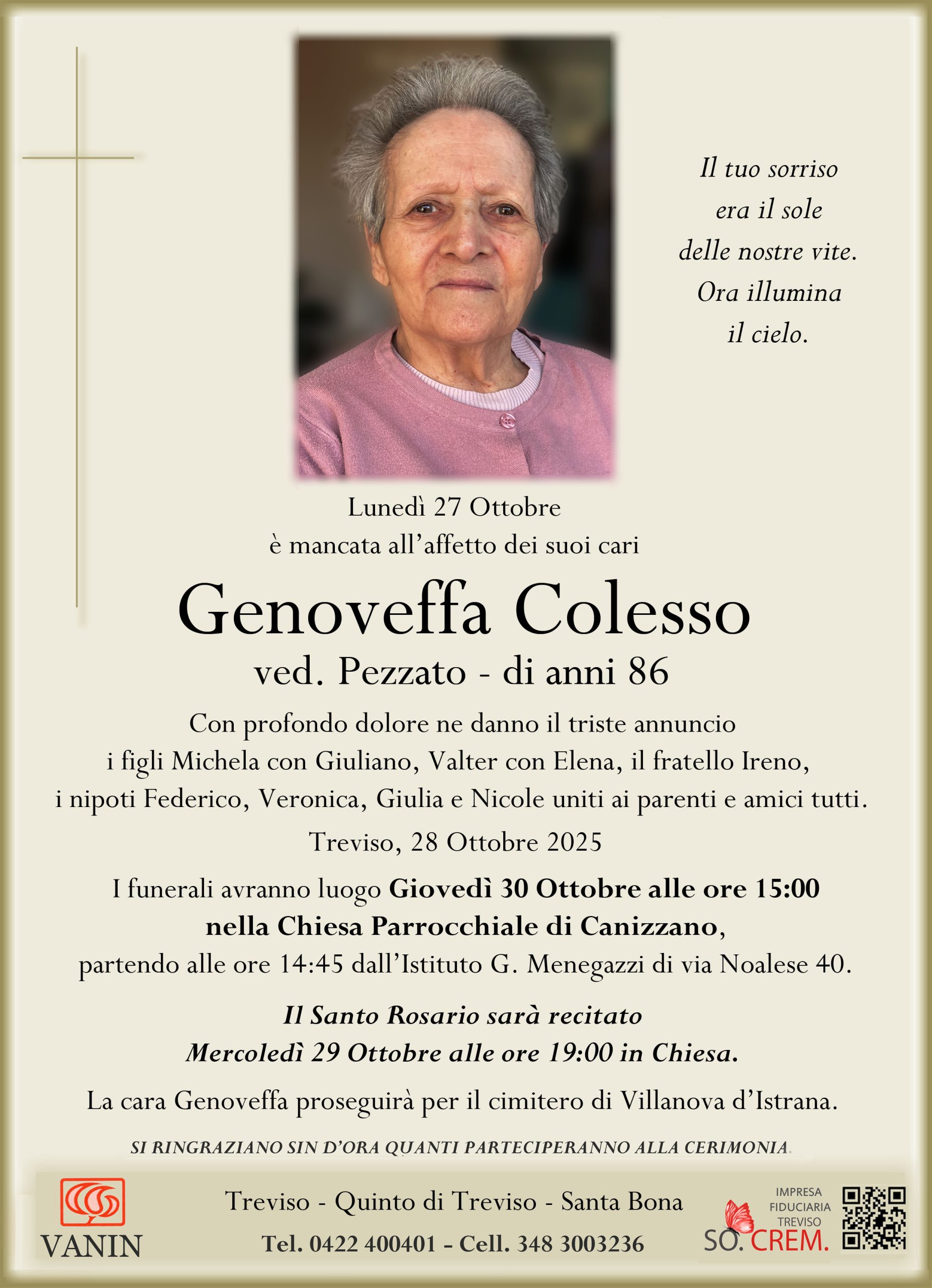 La cara Genoveffa proseguirà per il cimitero di Villanova d’Istrana.