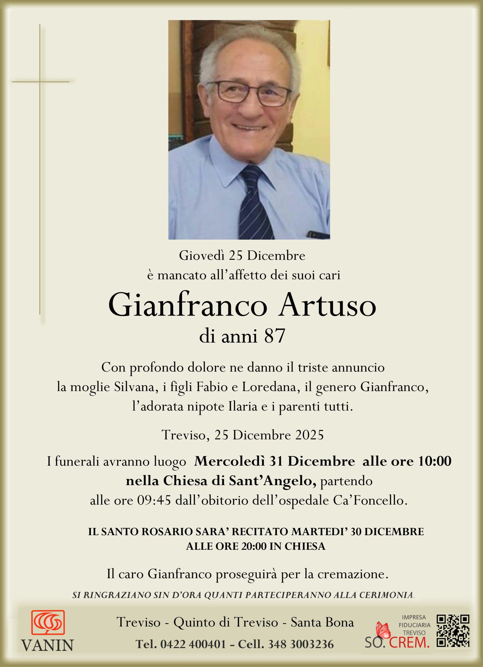 Data del decesso: Giovedì 25 Dicembre 2025Data cerimonia: Mercoledì 31 Dicembre 2025