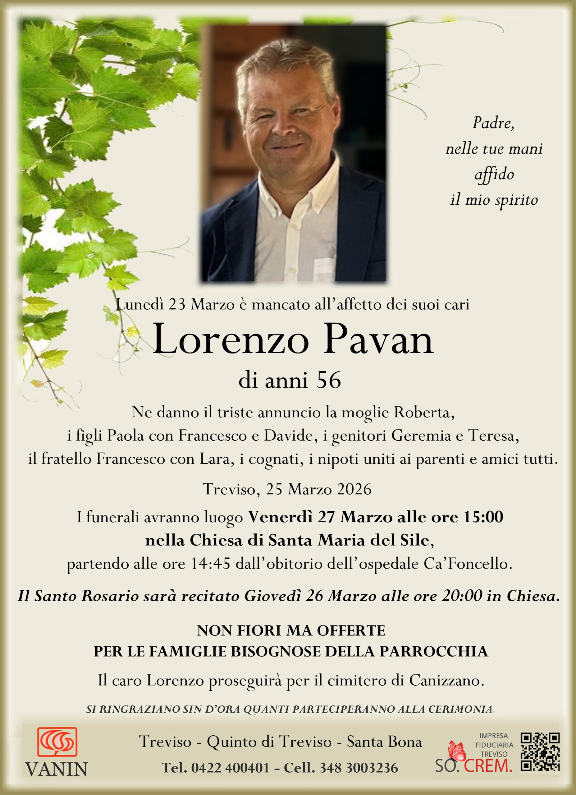 I funerali avranno luogo Venerdì 27 Marzo alle ore 15:00