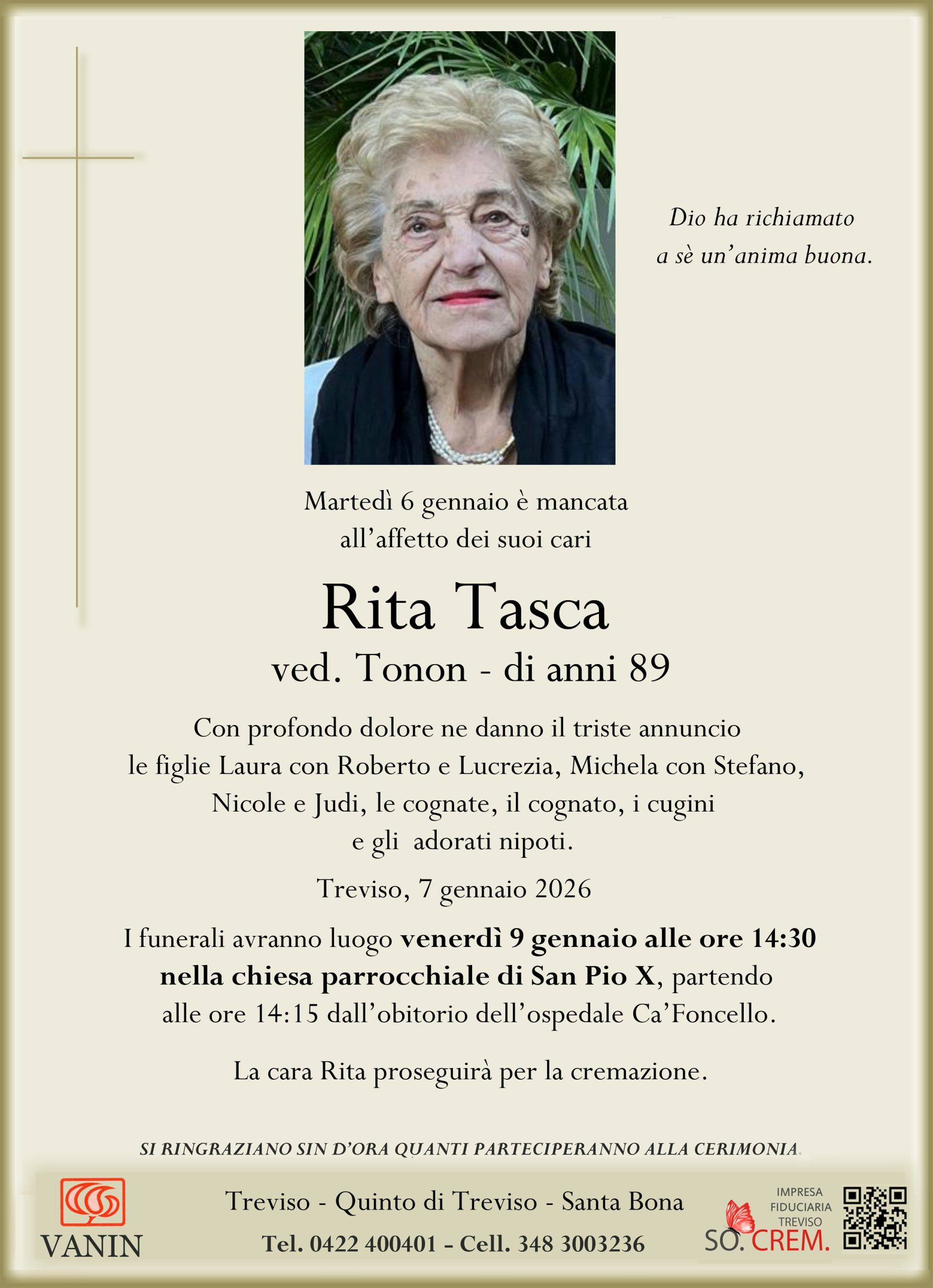 Data del decesso: Martedì 6 gennaio 2026Data cerimonia: Venerdì 9 Gennaio 2026