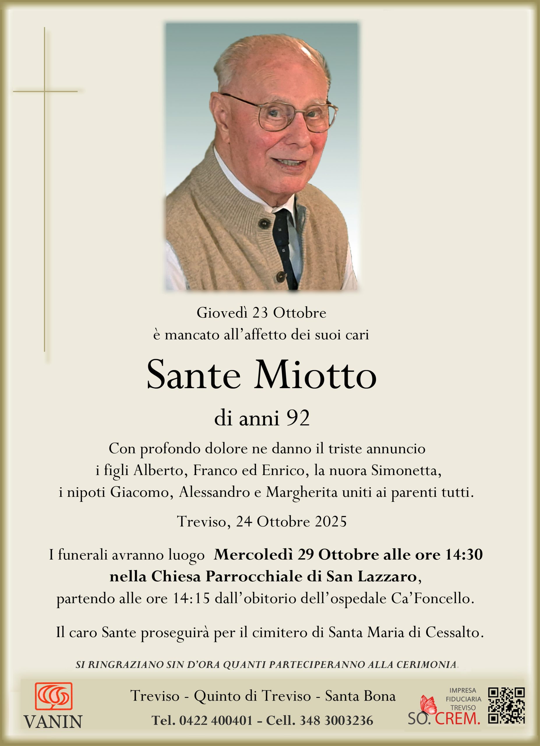 Il caro Sante proseguirà per il cimitero di Santa Maria di Cessalto.