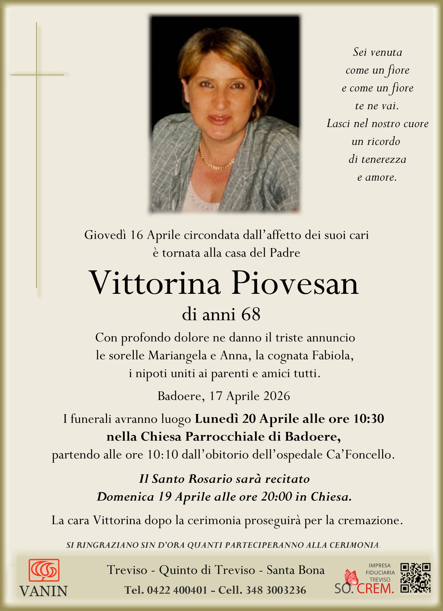 Data del decesso: Giovedì 16 Aprile 2026Data cerimonia: Lunedì 20 Aprile 2026
